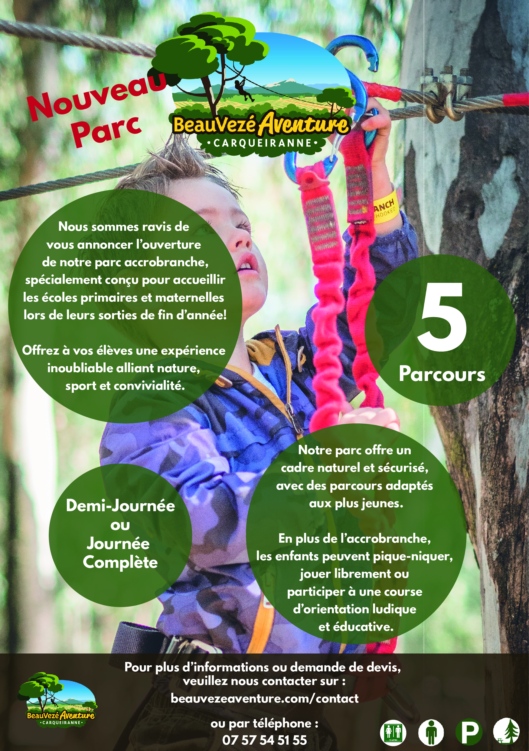 En complément, j’ai réalisé plusieurs bannières, le plan du parc ainsi que des affiches pour chacun des parcours. J’ai aussi pris en charge les démarches de partenariat avec les campings et villages vacances des environs, et j’ai contacté les écoles (maternelles, primaires), collèges, lycées et centres de loisirs afin de leur proposer une sortie dans notre parc.