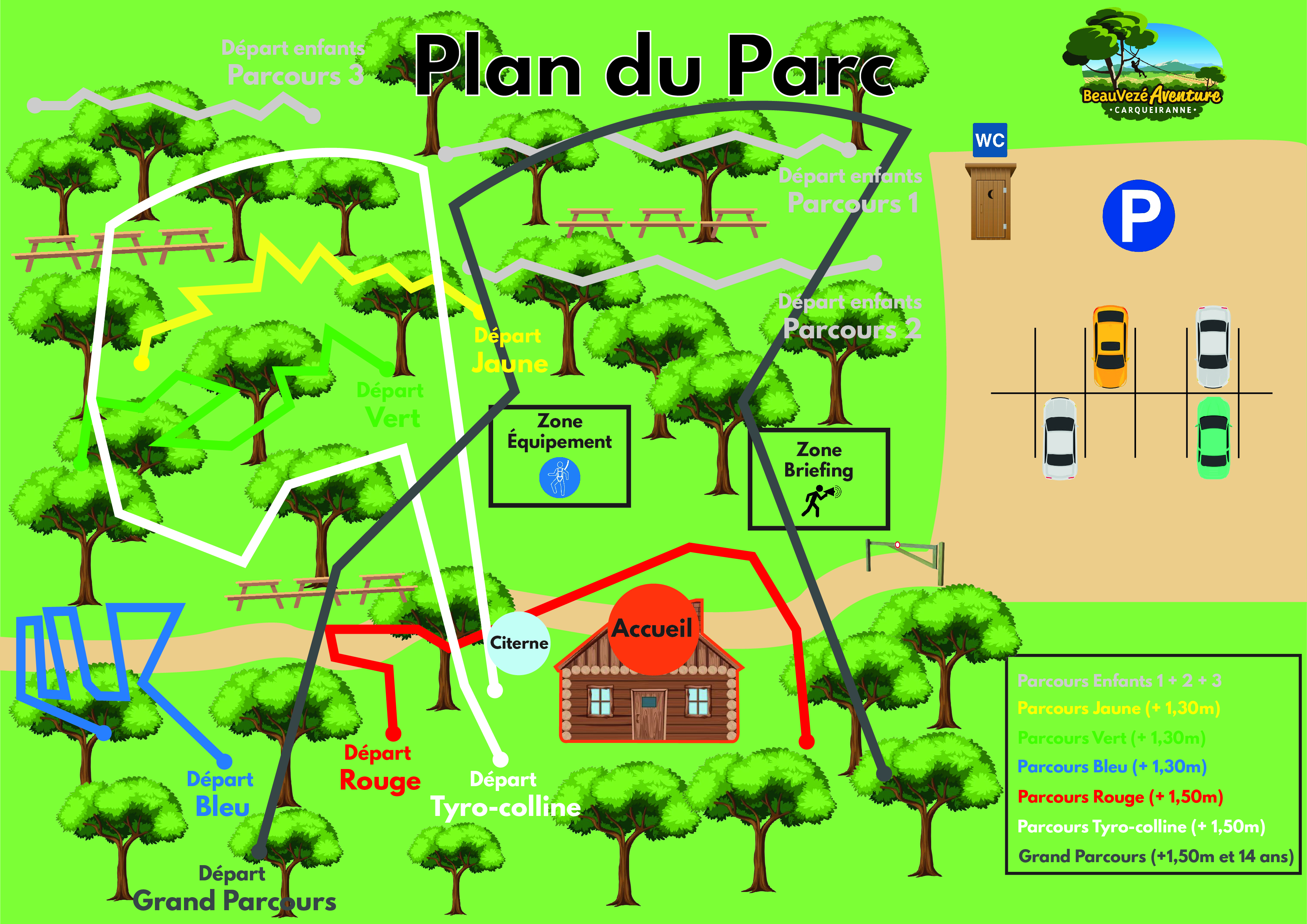 En complément, j’ai réalisé plusieurs bannières, le plan du parc ainsi que des affiches pour chacun des parcours. J’ai aussi pris en charge les démarches de partenariat avec les campings et villages vacances des environs, et j’ai contacté les écoles (maternelles, primaires), collèges, lycées et centres de loisirs afin de leur proposer une sortie dans notre parc.